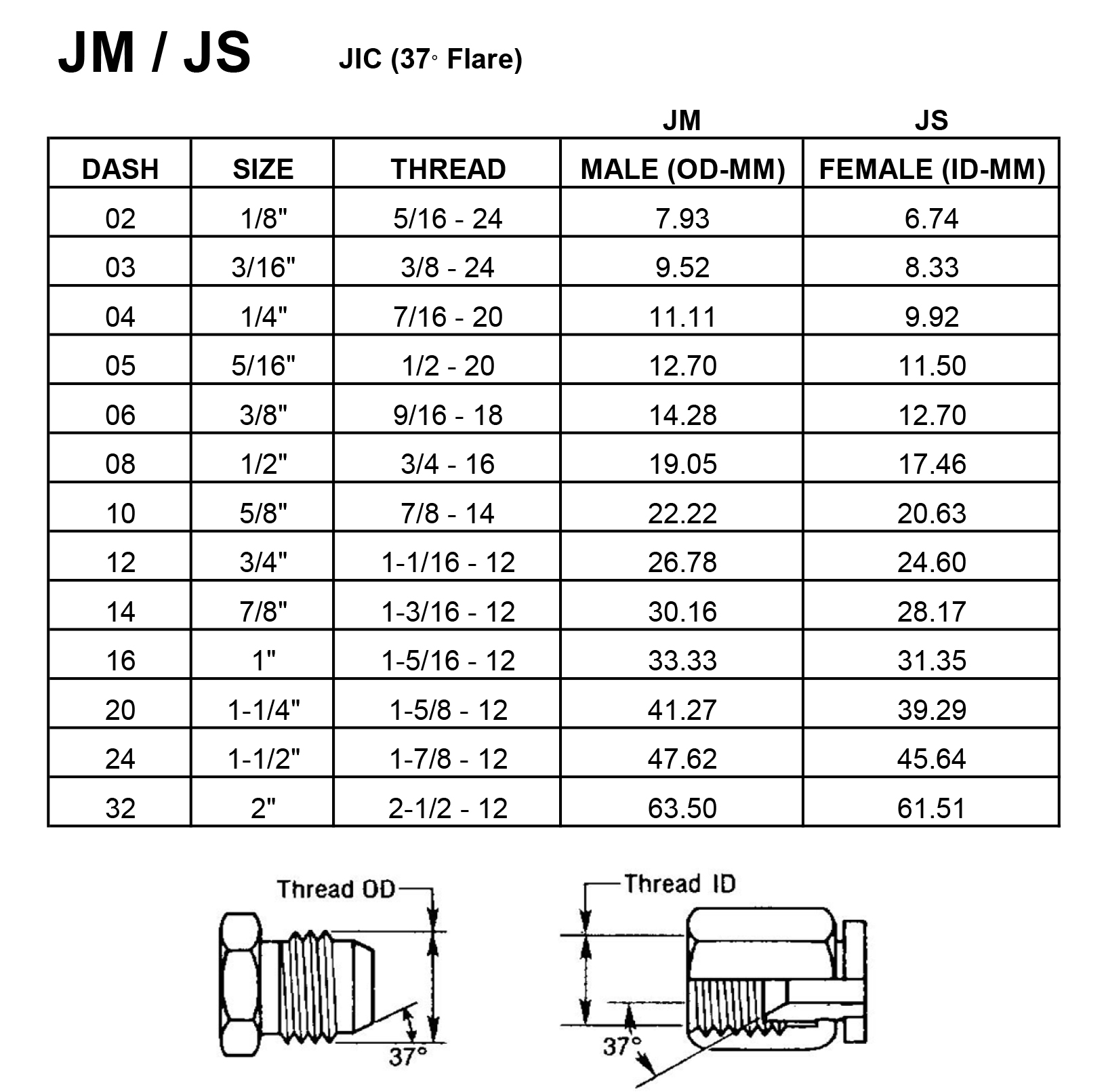 The Society of Automotive Engineers (SAE) specifies a 37ํ ํ angle flare or seat be used with high pressure hydraulic tubing. These are commonly called JIC couplings.The JIC37 ํ flare male will mate with a JIC female only.The JIC male has straight threads and a 37 ํ flare seat.The JIC female has straight threads and a 37 ํ flare seat.The seal is made on the 37 ํ flare seat.Some sizes have the same threads as the SAE 45 ํ flare. Carefully measure the seat angle to differentiate.