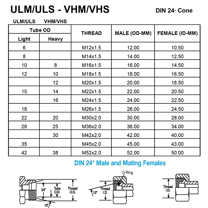 German DIN (Deutsche Industrial Norme)Popular couplings are German DIN (Deutsche Industrial Norme). A coupling refered to as "Metric" usually means a DIN coupling.DIN 24 ํ ConeThe DIN 24 ํ cone male will mate with any of the females shown.The male has a 24 ํ seat, straight metric threads and a recessed counterbore which matches the tube O.D. of the coupling used with it. The mating female is a 24 ํ cone with O-ring, a metric tube fitting or a universal 24 ํ and 60 ํ cone.There is a light and heavy series DIN coupling. Proper identification is made by mearuring both the thread size and the tube O.D. (The heavy series has a smaller tube O.D. but a thicker wall section than the light).When measuring the flare angle with the seat angle gauge, use the 12 ํ gauge. (The seat angle gauge measures the angle for the connector centerline)